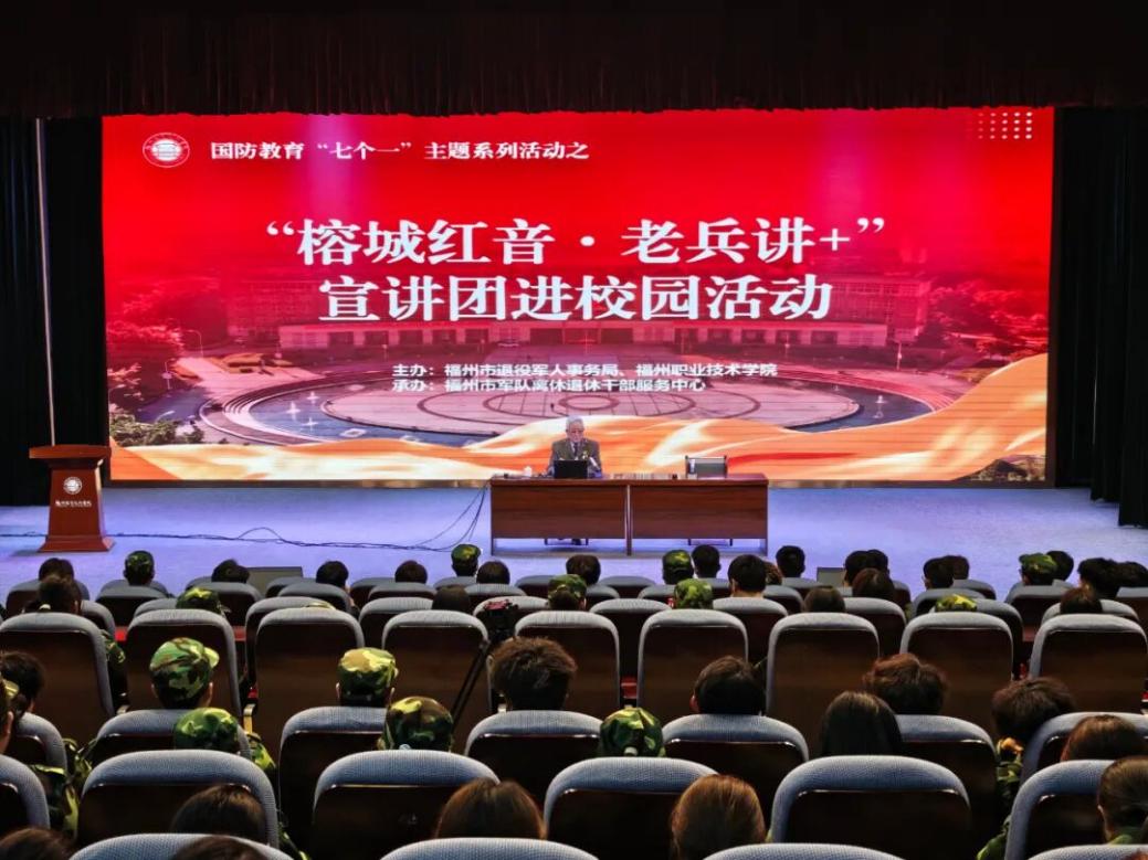 为加强青少年国防教育,厚植爱国爱军情怀,11月13日至14日,福州市退役军人事务局“榕城红音·老兵讲+”宣讲团走进福州职业技术学院,为500余名新生带来深刻的国防教育课。