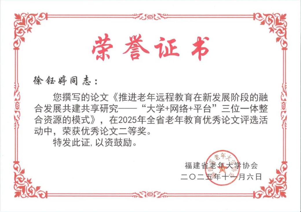 ——“大学+网络+平台”三位一体整合资源的模式》获评“2025年全省老年教育优秀论文”二等奖。