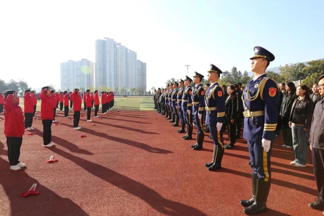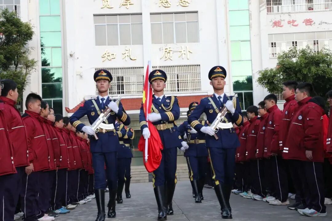 清晨,华坪女高操场上空,五星红旗在赤心国旗护卫志愿服务队队员的护卫下冉冉升起。他们以整齐划一的队列、铿锵有力的步伐,为全校师生展示了退役不褪色的军人风采。