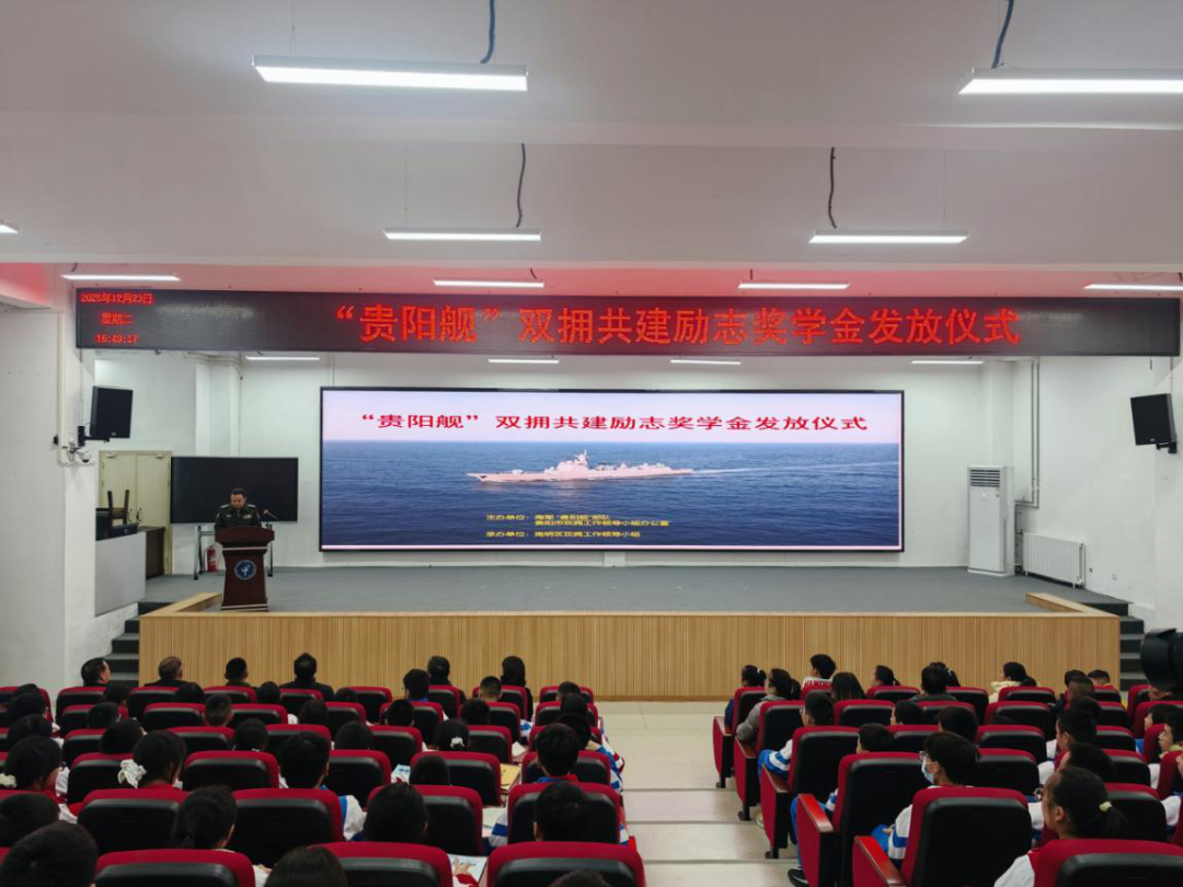 12月23日,一段连接着万里海疆与黔中筑城的双拥故事在贵阳市南明区第十八中学上演。北部战区海军“贵阳舰”双拥共建励志奖学金2025年首次发放仪式在此举行,为部分现役军人、退役军人子女及家庭困难学生送上了来自深蓝的激励与关怀。
