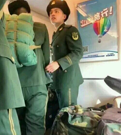 一批军校学员乘坐火车,个别没有买到坐票的乘客抱怨说当兵的为什么不给让座。火车行驶平稳后,学员中传出一个声音:“我们都站起来,给没有座位的人让个座。”