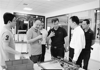创客和华中科技大学杨克成教授(左二)谈耦合机器人的研制。 |