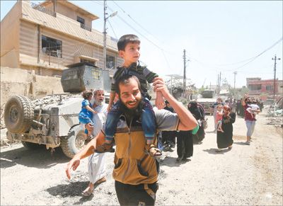 伊拉克政府军与“伊斯兰国”武装分子对摩苏尔的争夺仍在继续。伊拉克军方联合行动指挥部5月16日宣布,政府军已经解放了摩苏尔西城89.5%的地区。图为5月17日,摩苏尔居民从冲突区撤离。