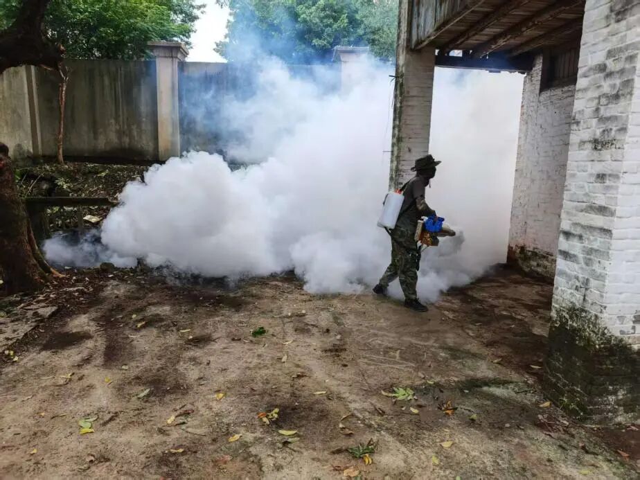 清晨的巷道,退役军人李金华扛着热烟雾机穿梭在其中,对绿化带、空置房、下水道等成蚊聚集地进行喷药处理。