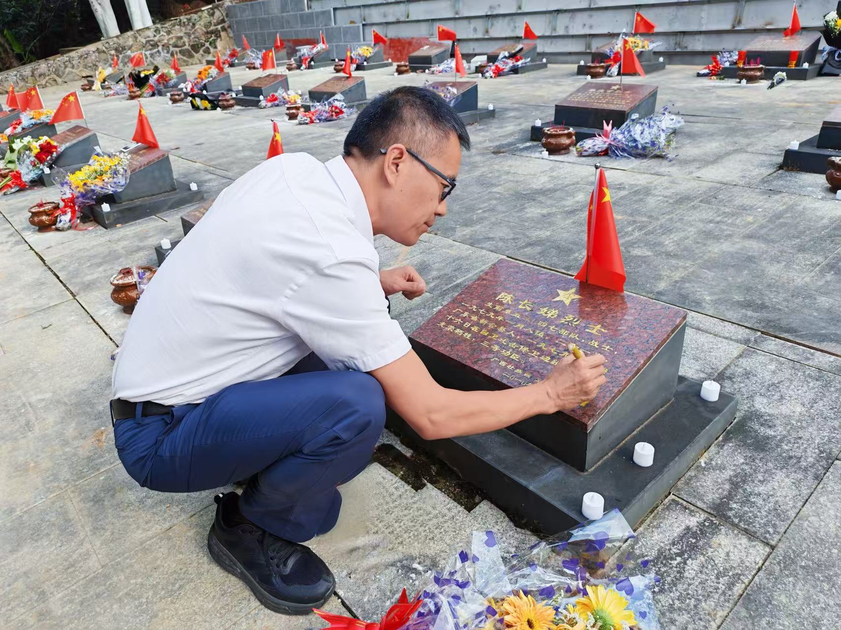 当天,副市长曹阳率队前往靖西、那坡烈士陵园,向江门籍烈士敬献花圈。全体人员行三鞠躬礼,依次献花、瞻仰,表达对英烈的悼念与敬仰。随后,全体党员面向党旗,举起右拳,庄严重温入党誓词。一行人分成四组,擦拭江门籍烈士墓碑,为墓碑描红,并对烈士墓数量、地理分布位置、管护情况进行信息核对与照片采集,为烈士信息精准建档留存了详细资料。最后,大家走进那坡烈士陵园陈列馆,通过历史图片、文物史料与文字记载,沉浸式学习英烈们为国家和民族浴血奋战的光辉事迹,在红色精神洗礼中汲取前行力量。
