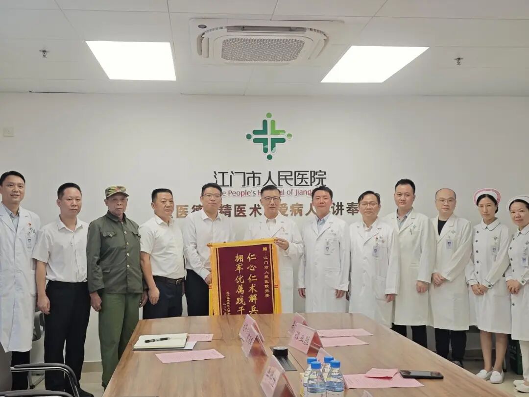 市人民医院负责人对开展退役军人医疗保障工作进行介绍,提出始终践行“人民医院为人民”的宗旨,将“拥军优属践于行”融入日常医疗服务中,并指出新时代的双拥工作,唯用心用情最是暖人心,要努力为退役军人及其他优抚对象提供更有温度、更有力度的健康保障。随后,区退役军人事务局分别向江门市人民医院党委及眼科团队赠送锦旗,对医院精湛医术与深厚拥军情怀表达诚挚感谢。