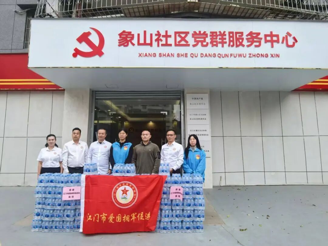 捐赠现场,在象山社区党群服务中心门前,一箱箱封装完好的矿泉水整齐堆放,传递着满满的关怀。江门市爱国拥军促进会会长张国强、蓬江区退役军人事务局副局长肖国强及社区工作人员共同完成物资交接。此次活动捐赠的矿泉水将重点用于社区疫情防控工作以及各类公共民生服务当中,切实把关怀落到实处。