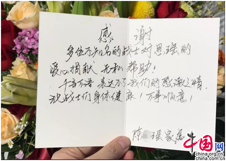 近日,晋江市退役军人志愿服务总队收到来自陈某瑶家属专程送来的花篮和感谢信,向退役军人志愿者无偿献血表示感谢。