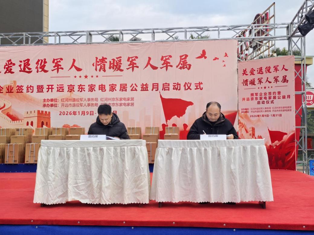 近日,开远市 “关爱退役军人 情暖军人军属” 拥军企业签约仪式暨开远京东家电家居公益月启动仪式举行。活动汇聚困难退役军人、军属代表及开远市退役军人事务局、开远京东家电家居等多方力量,以专属优惠与公益帮扶为军人军属、退役军人送上关怀。