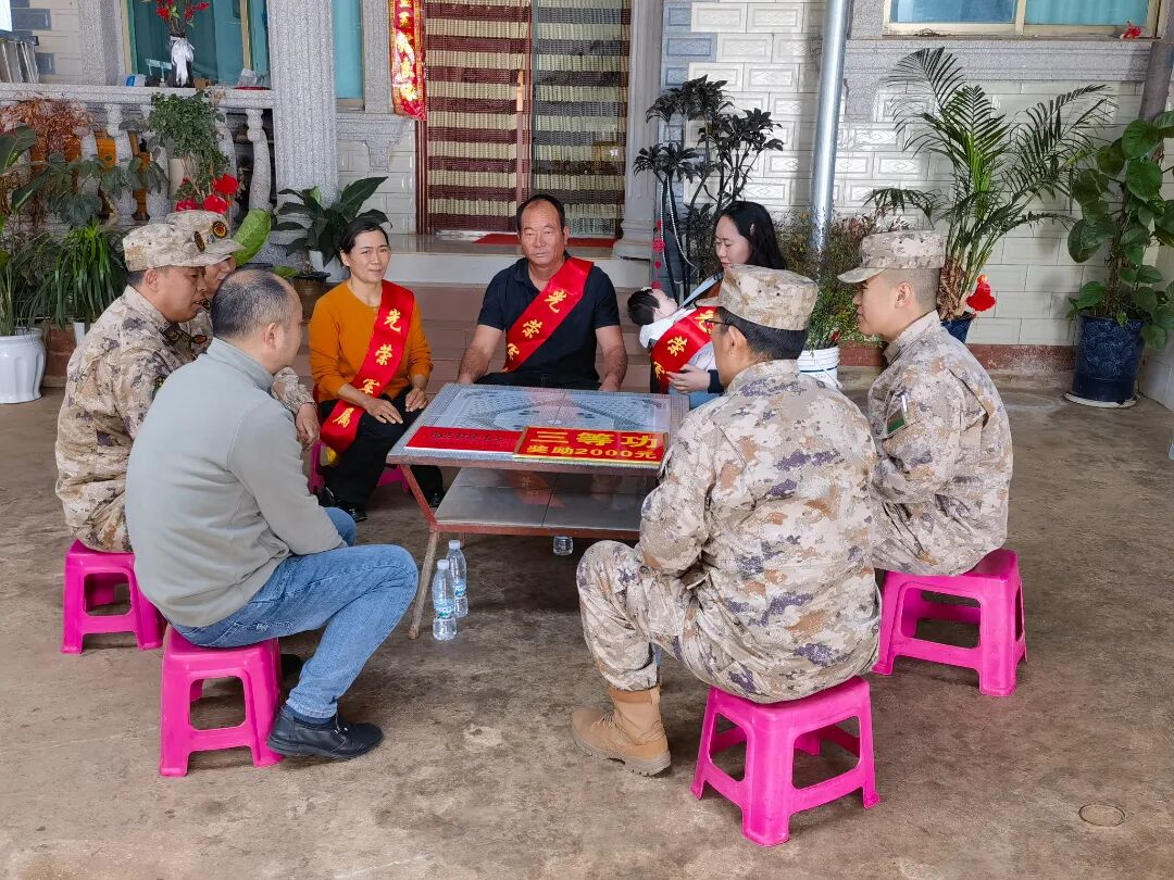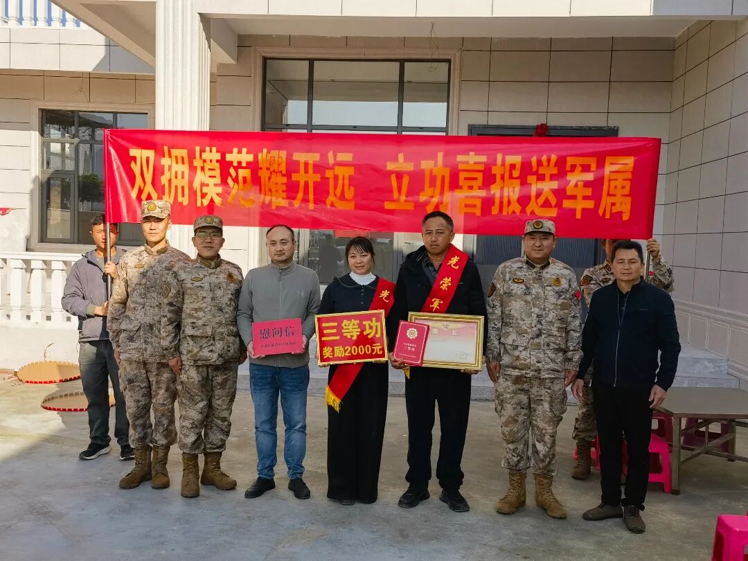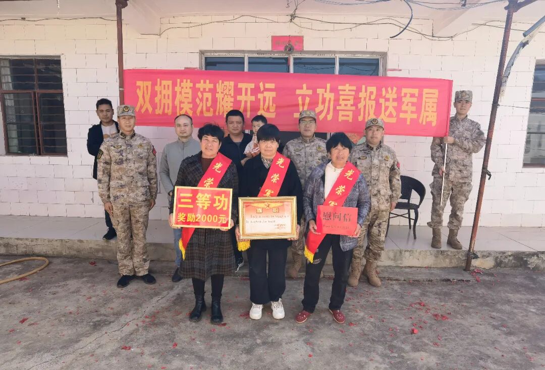 1月21日,开远市退役军人事务局联合市人武部、相关乡镇(街道)工作人员组成慰问组,为李旭、庞肖飞、严浩南3名荣立三等功的现役军人家庭送去立功喜报和市委、市政府的亲切关怀,让军人军属共享荣耀时刻。