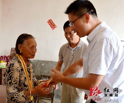 红网双峰站9月18日讯(分站记者 龚闯 通讯员 孙燕军)9月17日,双峰县荷叶镇党委书记邹和聚、县民政局副局长葛光永一行到长塘村排子组,为抗战老兵熊金生遗孀彭秀英颁发了“中国人民抗日战争胜利70周年纪念章”,并给她送去了5000元的慰问金。这枚沉甸甸的纪念章是中共中央、国务院、中央军委为纪念抗日战争胜利70周年向全国抗战老兵颁发的。