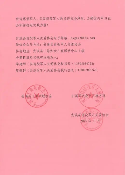为进一步做好退役军人服务保障工作,汇聚社会力量关爱退役军人,2025年11月以来,泉州市安溪县退役军人事务局联合县退役军人关爱协会与县工商联发出倡议,在各异地安溪商会中建立“退役军人联络站”。