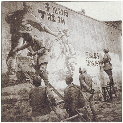 徐灵等人在敌占区农村的墙壁上绘制抗日漫画。