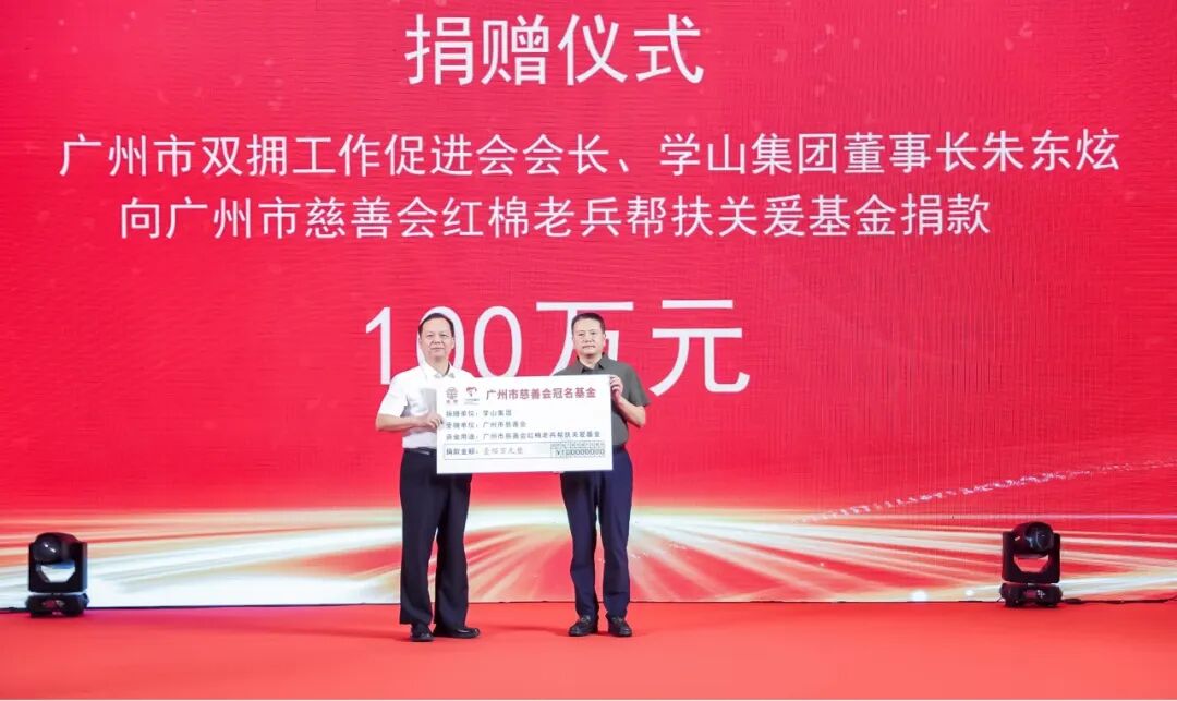 在欢乐的乐曲中,学山集团董事长朱东炫向广州市慈善会红棉老兵帮扶关爱基金捐款100万元,有关领导向第五届理事会单位、会员单位授牌和颁发证书,换届大会在庄重、热烈的氛围中圆满闭幕。(广州市双拥办)