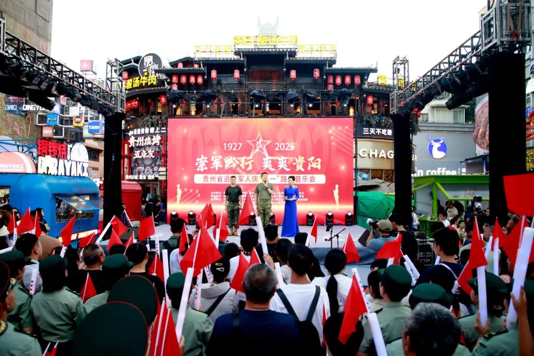 “八一”当天,贵阳青云市集内红旗飘扬、歌声嘹亮。一场由退役军人带领的《我和我的祖国》合唱吸引众多游客驻足跟唱,气氛热烈而动人。