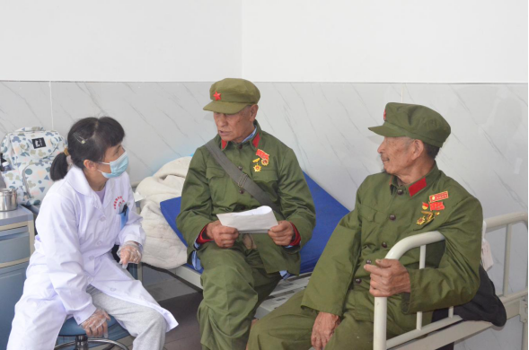 3位参加过边境自卫反击作战的老兵,穿着军装来到巡诊现场。做完检查后,他们与候诊老兵共叙军旅时光、分享参战经历,临走时深情地对医务人员说:“感谢党和政府没有忘记我们,谢谢你们大老远来看望我们……”