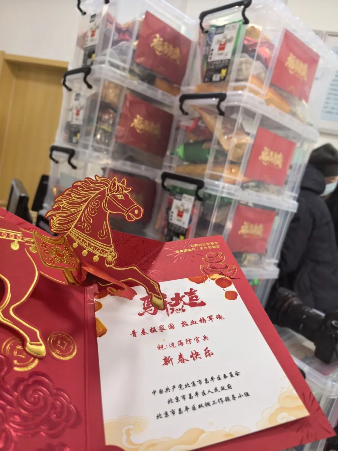 在中国邮政(昌平政府街邮政支局)柜台前,工作人员耐心细致进行包装、检查工作,一箱箱年货即将送往千里之外的边海防哨位。此次春节专项慰问活动,区双拥办提前谋划、广泛征集、优中选优,准备了数百份新春年货慰问品与贺卡、慰问信、春联福字、书法绘画作品等一同送往边海防官兵手中,一箱箱慰问品饱含着昌平区委、区政府和人民群众对边海防官兵的关心关爱。