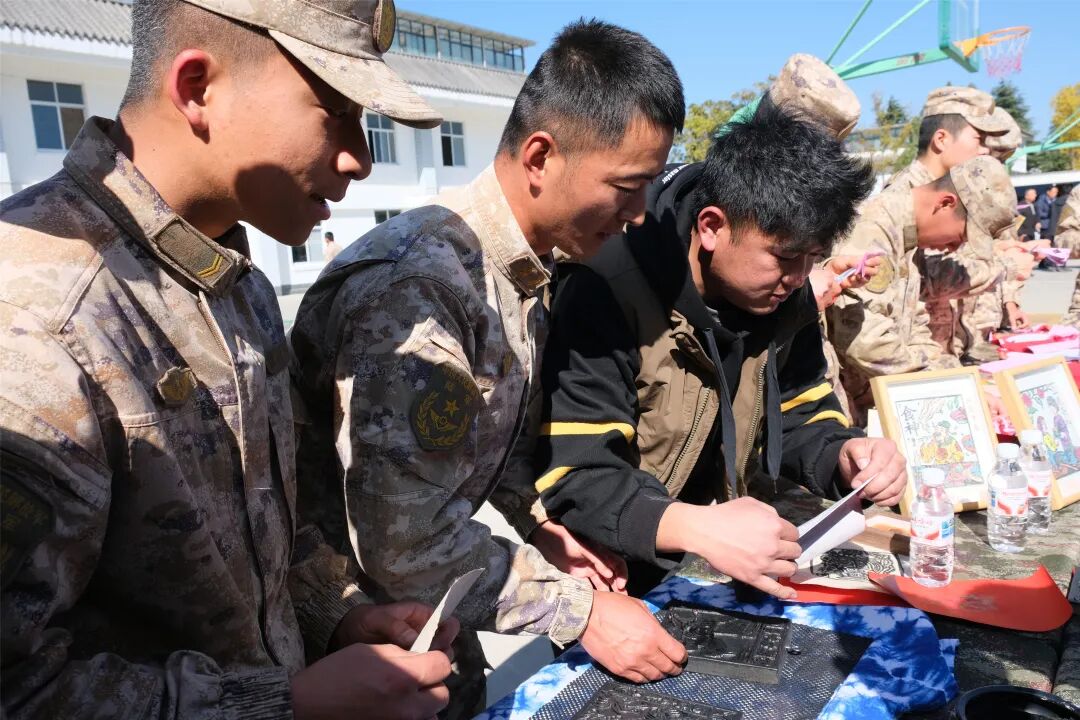在政策宣讲区,工作人员为官兵们带来了法律、金融、就业创业、移交安置、优抚优待等多方面的政策法规宣讲,现场答疑解惑;在春联书画区,艺术家们挥毫泼墨,为官兵们现场创作饱含祝福的春联以及一幅幅精美雅致的水墨画作品;在非遗体验区,官兵们认真和非遗传承人学习相关知识,并在他们的指导下体验剪纸、甲马等非遗技艺;在乡村振兴产品展示区,官兵们到摊位上了解、品尝各类本地特色产品,咖啡、土豆制品、鱼干等产品颇受官兵们的青睐和关注。