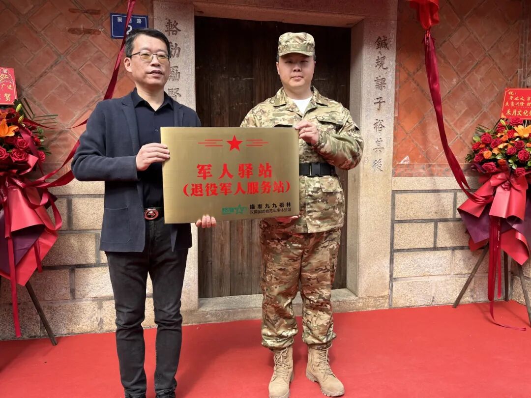 晋江市退役军人事务局副局长、市双拥办常务副主任陈达森向体验馆授予“军人驿站(退役军人服务站)”牌匾