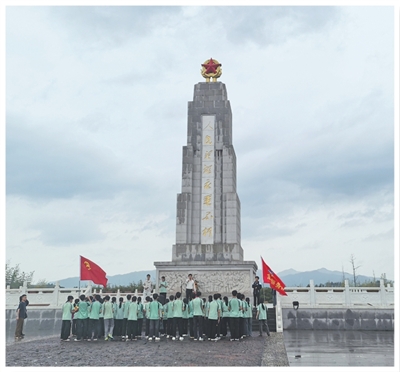 学生在于都烈士纪念园的革命烈士纪念碑前开展纪念活动。
