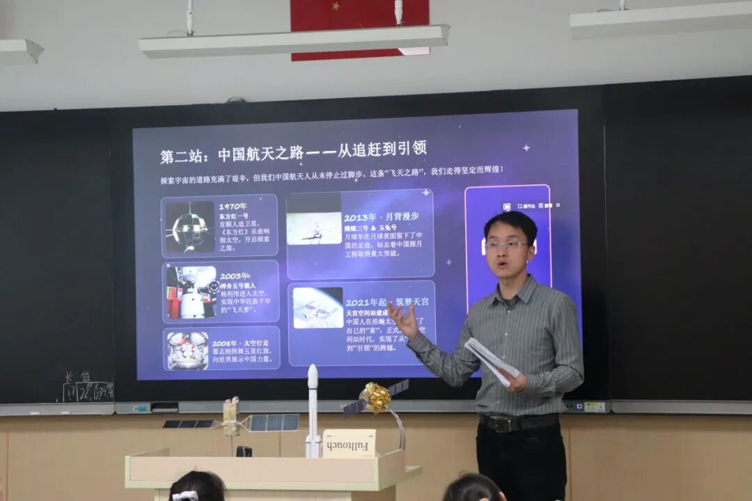 课堂上,震撼的航天实景图片、精彩的发射纪实短视频和鲜活的航天榜样事迹,迅速点燃了同学们探索星空、探秘航天的浓厚热情。两位军代表细致讲解航天基础常识、航天器运行原理及航天员太空工作生活日常,让学生们真切感受我国航天事业的硬核实力与发展荣光。同时,结合国防军工工作实际,深入阐释“热爱祖国、无私奉献、自力更生、艰苦奋斗、大力协同、勇于攀登、开拓创新、追求卓越”的“两弹一星”精神内核,引导同学们认清个人成长与航天强国建设、民族复兴伟业的紧密联系,勉励少年学子心系家国、立志报国,未来争做大国重器建设者、航天事业接班人,传承好国防建设者的红色奉献基因。