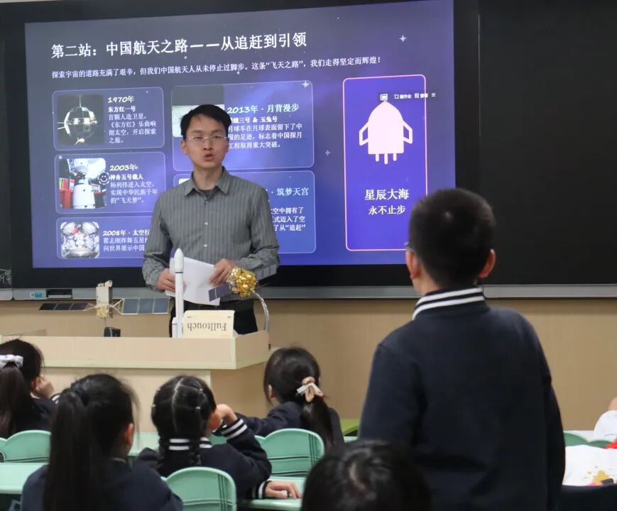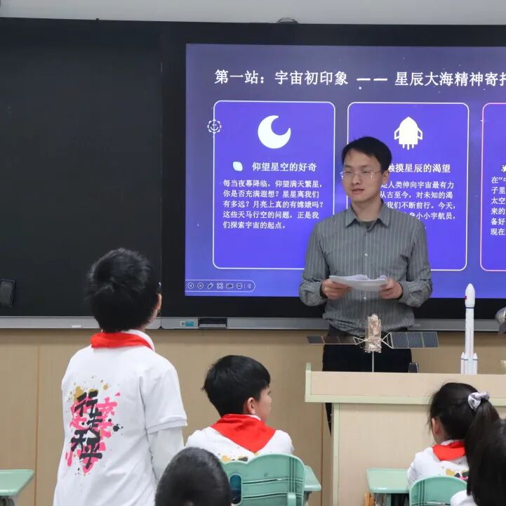 逐梦航天报国路,薪火相传育新苗。2026年4月24日,第十一个中国航天日如期而至,今年恰逢中国航天事业创建70周年。为大力弘扬航天精神、赓续军工红色血脉,扎实推动国防教育进校园常态化走深走实,厚植青少年爱国强军情怀,上海市徐汇区退役军人事务局协同航装驻上海某军代室,自今年2月起统筹谋划、周密筹备本次航天主题系列活动。军代室与建襄小学高度重视此次宣讲工作,专人专班反复打磨授课课件、细化对接活动流程、严格完成材料报批审查等各项前期准备,选派戴维、邹珺两位文职军代表走进校园,开展“星辰大海,我们来了”航天主题授课,为小学四年级学子送上一堂兼具科普性与思想性的航天思政课,以军工初心浇灌少年航天梦想,让强国强军种子在校园沃土落地生根,活动取得良好教育成效,师生反响热烈。