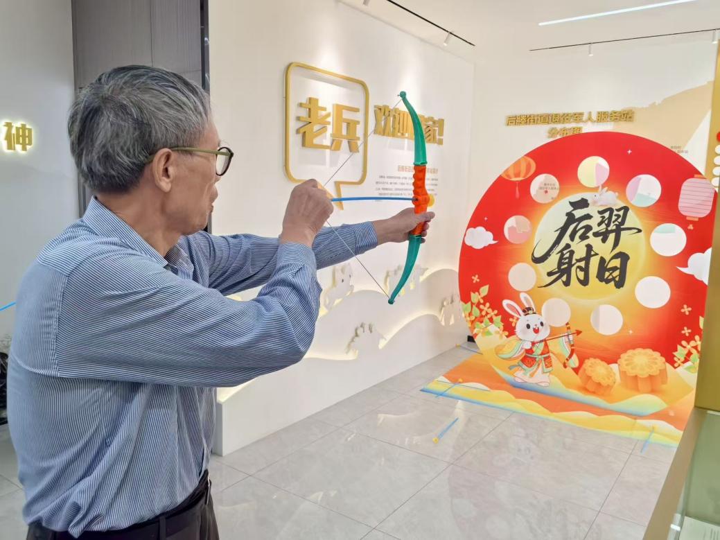 在趣味“射日”小游戏环节中,退役军人和军属分组竞技,拉弓、瞄准、发射一系列动作干脆利落,一支支箭射中靶心,引得现场阵阵喝彩,尽显军人本色。