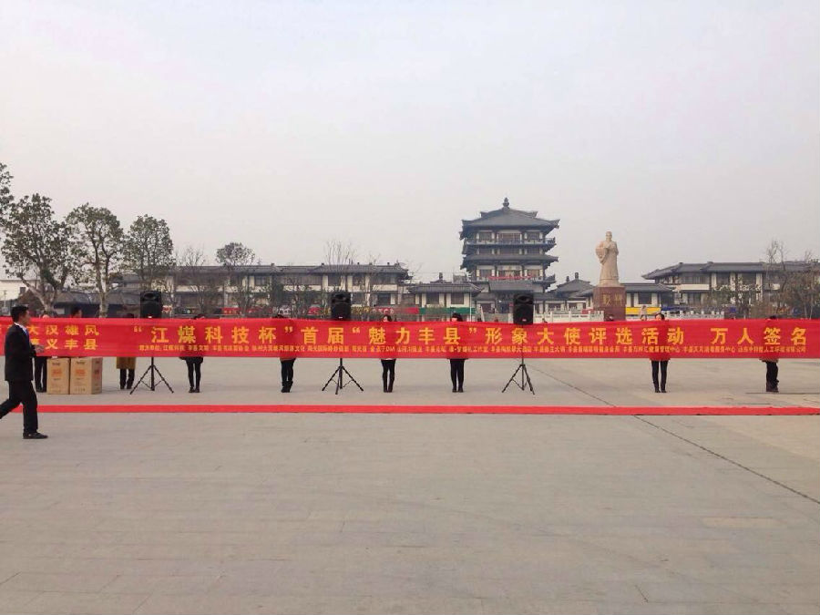 2015年1月3日上午十时,在江苏省丰县刘邦广场以及丰县城区30多个主要街道、繁华商业街区,由徐州江煤科技集团公司、丰县文联、丰县书法家协会、中国网魅力中国频道、阳光报、丰县万邦汇健康管理中心、丰县陶然翠大酒店、山东中科能人工环境有限公司、丰县论坛、德庄火锅、丰县普瑞菲特健身中心、丰县天天消毒服务中心、缘.梦婚礼工作室、山河川报业、金点子DM、有情有义丰县人志愿服务队、徐州大汉雄风旅游文化发展有限公司、徐州凤凰湖休闲养老产业有限责任公司等50多家单位自发发起的支持“魅力丰县”万人签名活动。另外,百名书法家齐书“魅力丰县”活动也同时启动。“中华孝女”谢淑华,丰县文联常务副主席、丰县书法家协会常务副主席张尊军、中国网魅力中国频道副总監马新存、魅力丰县活动组委会秘书长万利忠以及企业代表、社会各界人士、丰县群众逾万人参加了签字活动。